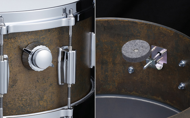 Designed as a full-contact snare wire system, TAMA's innovative Roller Action Strainer offers extremely detailed control over snare buzz tone & sensitivity. Past parallel action strainers required an internal rod to operate the strainer & butt at the same time, but TAMA's new streamlined design eliminated the need for an internal rod by utilizing a single on/off lever & dual guide rollers for easy, simple, and versatile adjustment. The guide rollers gently rotate to achieve a smooth feel for consistent & reliable operation. This unique & popular system has been faithfully reproduced for this 50th Anniversary Reissue model.