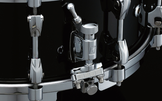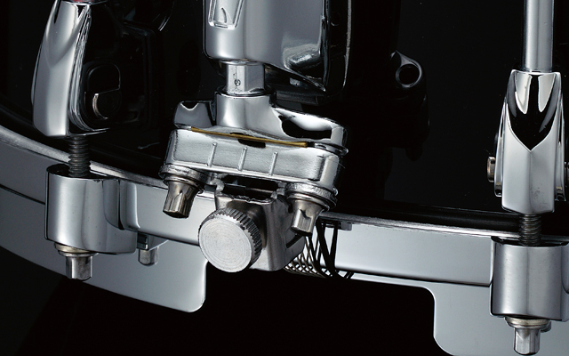 STARPHONIC's strainer uses a "Linear-Drive" system, which we designed to provide greater control of the lever adjustment arm and more precise control of the strainer's deployment motion. Even if you move the arm rapidly, you will not hear the typical "slap" of the wires hitting the bottom head. The strainer movement is designed to work in a true "linear motion", similar to the motion found on "round sproket" drum pedals. Most strainers are not designed like this and tend to speed up right before the snare wires connect with the snare side head. Also, by tilting the angle of the butt plate 30 degrees, this design holds the snare wire cords or tape more firmly and reduces unnecessary pressure on the strainer and shell.