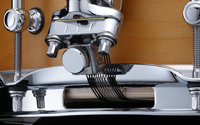 Six strands of Nickel guitar strings are flanked on each side by three strands of nylon coated, Stainless Steel wire. The wire seats within the throw off and butt plate, eliminating the need for snare chord and guessing the correct tension.