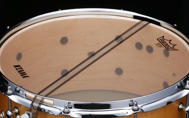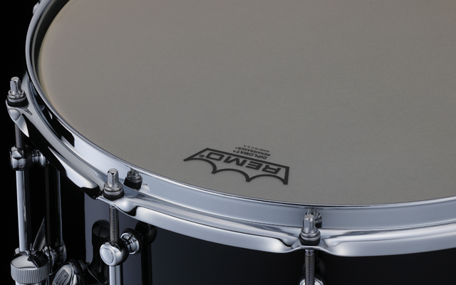 The Diplomat Renaissance head is equipped for batter side which gives a warm, dark tone with a soft feel. For the bottom side, REMO® diplomat hazy snare side head is equipped.