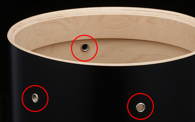 The alternative set of holes in the TAMA snare drum holder allow for changing the position of the drum from straight to angled.