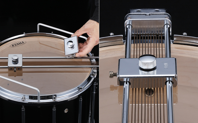 TAMA "Buzz Killer Mutes" are used to control sensitivity of the guts. This eliminates the need for tape on the guts and permits correct functioning of the strainer. Mutes can be easily positioned for the desired sound and securely locked down on the gut frame. Subtle differences in muting can be obtained by the adjustment knobs. The mutes can be easily removed or added as needed. "Buzz Killer Mutes" allow for perfect flexibility for indoor or outdoor tuning of the snare sound.