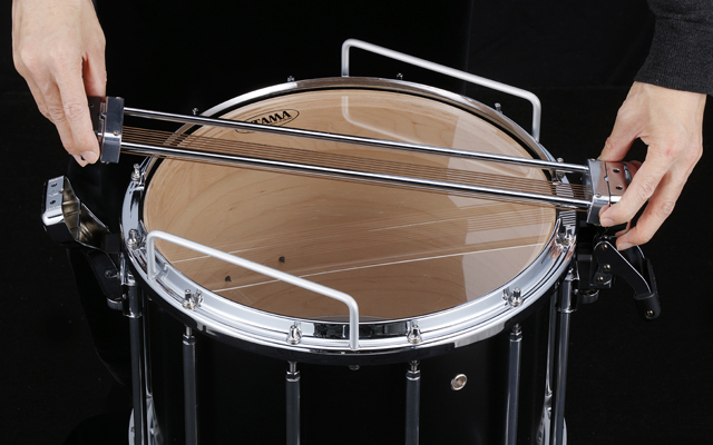 The Gut Frame of TAMA Fieldstar Marching Snare Drums can be removed and replaced in seconds. This quick detach design allows for changing the bottom head without disturbing the tension of the guts or position of the mutes. The two arms of the frame fully support the gut tension, removing the unwanted pressure from the shell for an unrestrained resonance.