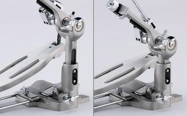 By simply loosening the square head bolt of the side pillar, you can change the height of the beater shaft. This makes it possible to have the beater strike the center of the bass drum without using a bass drum lifter or adjusting the length of the beater.