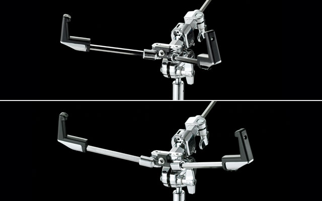 Since no vertical post is needed to adjust the spread of this snare basket, you can achieve a much lower position. Simply by loosening the T-nut, you can adjust the length of the arm. The claws of the snare drum basket provide minimum contact with the snare drum, maximizing resonance while still securing the drum to the stand.