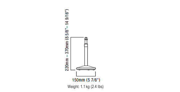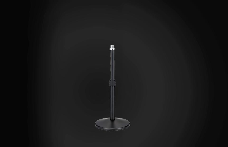As a member of the Iron Works Tour family-the MS50BK tabletop stand delivers smart looks with quality and durability you'd never expect from similarly priced stands. Its lighter, smaller size zinc die-cast round base and black aluminum 2-stage pipe construction make it an ideal option when multiple tabletop stands are required.