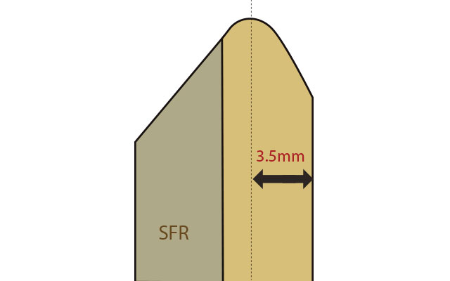 Vibration produced by hitting a drum transfers to the shell through the contact point between the drumhead and the shell. Therefore, the shape of the bearing edges is one of the most important factors in a drum's sound. STAR drums feature a bearing edge shape as shown in the diagram. Its peak is rounder than TAMA's traditional bearing edge. This rounded peak provides more contact between the drumhead and shell, allowing vibration to travel from the drumhead to the shell more efficiently. Also, the peak position of the edge is 3.5mm from the shell's outer surface, which further improves contact between the drumhead and drum.