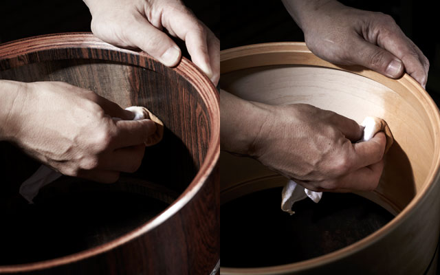 In a very time consuming process, the bearing edges and insides of all STAR drum shells are meticulously hand finished with oil for a luxurious look. STAR Bubinga shells feature an oil-finished inner ply of Cordia, while STAR Maple drums feature oil-finished Maple interiors