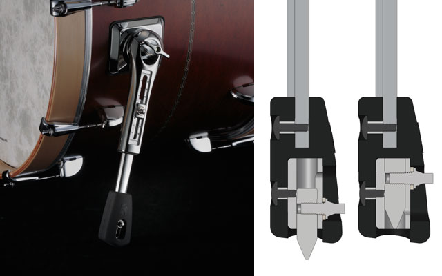 The bass drum spurs adopt the same concept as the floor tom legs. Since the bass drum spurs receive the horizontal impact from the pedal striking the bass drum, properly absorbing this impact is critical to the natural resonance of the bass drum shell and for a comfortable feel from the bass drum pedal. This is why we designed STAR bass drum spurs with soft, high-mass rubber feet.