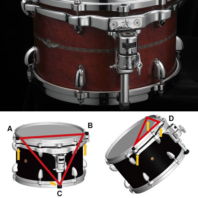 If you tilt your drums beyond a certain angle, which should only apply to a small minority of drummers, this mounting system operates a little differently. If a drum is titled beyond a certain angle, the bottom hoop will no longer be in contact with, or supported by, the bottom contact point (C). In that case, a different contact point (D), located on the batter hoop, comes into play. Although the triangle formed by these three points is much smaller, it does not put more strain on the batter hoop because of the angle of the drum. So the drum's natural resonance is still preserved in this case.