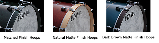 Bass drums come standard with matching finish wood hoops. We also offer a Natural Matte Finish and a Dark Brown Matte Finish for the hoops, available for most drum colors.