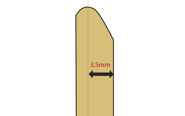 Vibration produced by hitting a drum transfers to the shell through the contact point between the drumhead and the shell. Therefore, the shape of the bearing edges is one of the most important factors in a drum's sound. STAR drums feature a bearing edge shape as shown in the diagram. Its peak is rounder than TAMA's traditional bearing edge. This rounded peak provides more contact between the drumhead and shell, allowing vibration to travel from the drumhead to the shell more efficiently. Also, the peak position of the edge is 3.5mm from the shell's outer surface, which further improves contact between the drumhead and drum.