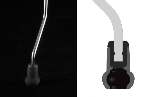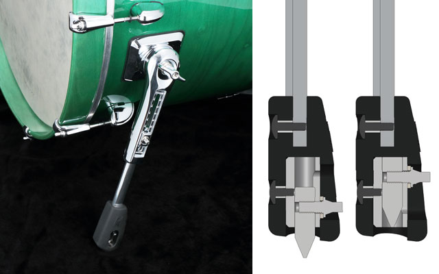 The bass drum spurs adopt the same concept as the floor tom legs. Since the bass drum spurs receive the horizontal impact from the pedal striking the bass drum, properly absorbing this impact is critical to the natural resonance of the bass drum shell and for a comfortable feel from the bass drum pedal. This is why we designed STAR bass drum spurs with soft, high-mass rubber feet.