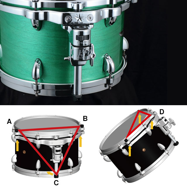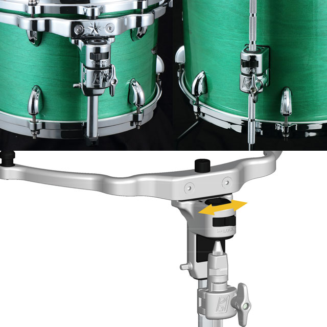 To maximize the natural resonance of drums, tom toms should be mounted with minimal stress and strain on the shells and hoops. STAR drums feature our brand new mounting concept to achieve this goal, called the Super Resonant Mounting System.