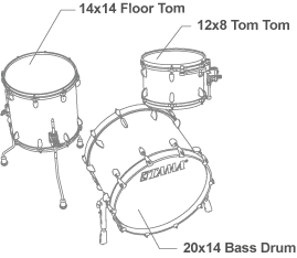 This diagram shows the numbering system for a single drum. For example, take part number "TWB2218". The following meanings are assigned to each letter: The first is the series. The second is the type of wood. The third is the type of drum: B for bass drum, T for tom-tom, F for floor tom, and S for snare drum. The fourth and fifth numbers are the diameter. The sixth and seventh numbers are the depth.