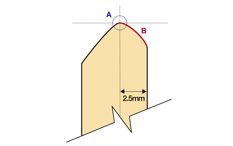 The shape of the edge is one of the most important factors which affect drum sound. Because the drumheads provide the important source of vibration, the shape of the contact point of the head and shell determines and defines the sound. This is why TAMA has worked so extensively on achieving the most functional shape for the drum head and edge. Picture shows a sectional view of the drum's bearing edge. As shown in Part A, the angle of the top edge is set 2.5mm inside from the outer surface of the shell. The edge is cut to a round collar so as to follow the natural shape of the drumhead (B). This design, which creates a better fit between the drumhead and bearing edge, maximizes the resonance of drum.This bearing edge shape is part of our TAMA tradition and is crucial in providing TAMA's unique drum sound.
