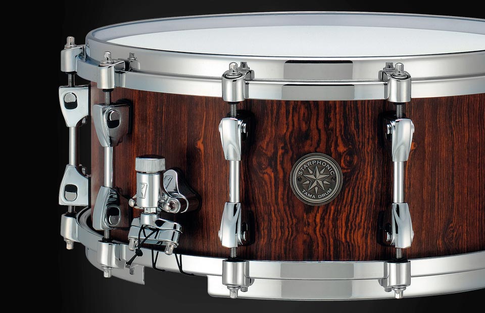 The Bubinga snare features a thinner shell than our standard Starclassic Bubinga drums for a softer and warmer sound. Reducing the shell thickness rounds out Bubinga's massive sound but still demoostrates outstanding rich tone and full resonance. The Grooved Hoop emphasizes its sharp projection and warmth of Bubinga's low-end. A beautiful outer ply of Matte Natural Cordia wood perfectly matches this drum's noble sound.