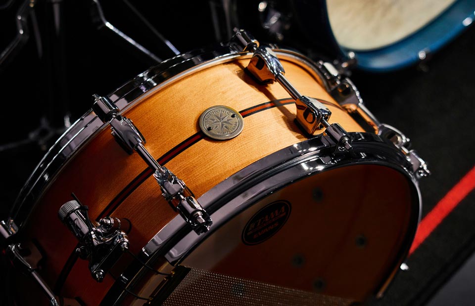 This Starphonic series snare drum features an all Spruce shell. A popular wood for acoustic guitars, Spruce has a warm and pleasant high-mid tone. Featuring 8-lugs and TAMA's unique Grooved Hoop, this snare drums delivers sharp attack with clear and controlled projection, beautifully complementing Spruce's mellow tone. Finished with center stripe detailing that emphasizes the luxurious look and feel of Spruce.
