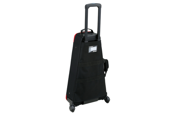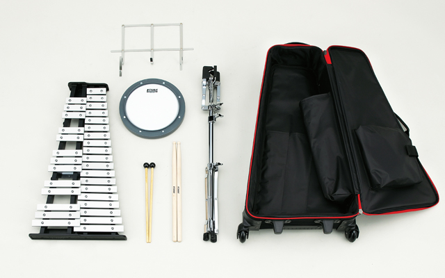 Bell Kit With Roller Bag features a keyboard, music stand, practice pad, mallets and sticks, as well as a stand for either the bells or practice pad, and a roller-style bag.
